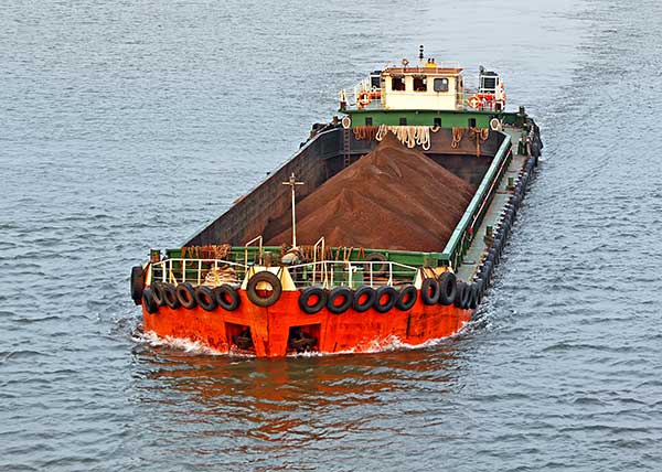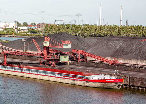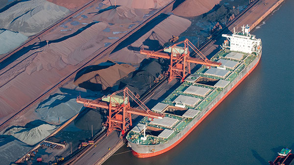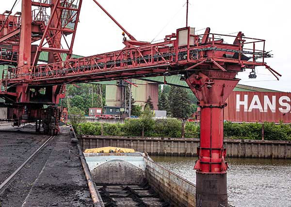 Erz wird per Umschlagsbrücke oder Kran entladen.