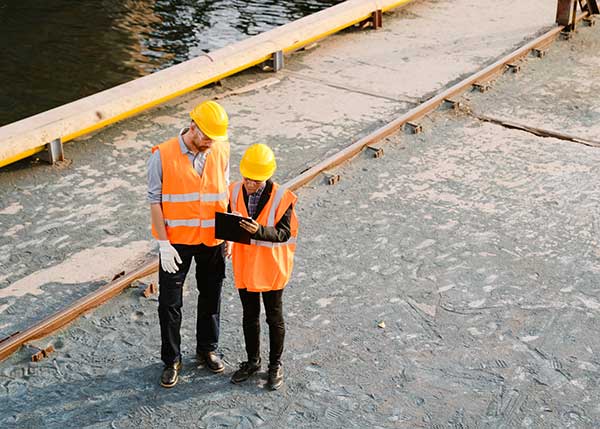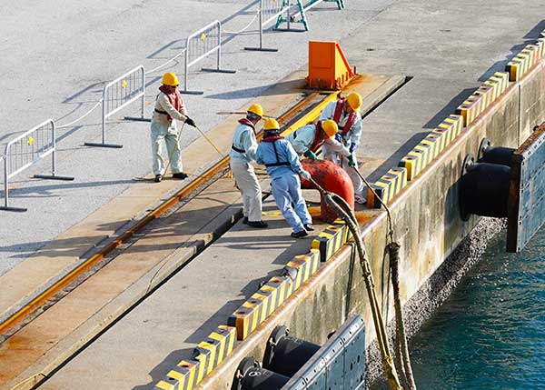 Das Schiff mit dem Erz erreicht das Terminal. Festmacher sichern das Schiff am Kai und geben dem Schichtleiter die Information, dass das Schiff festgemacht wurde.