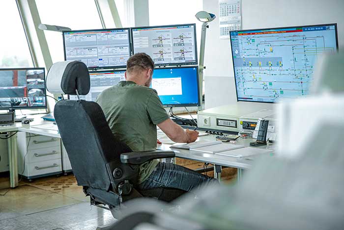 Der Leitstand eines Massengutterminals ist die zentrale Steuer- und Überwachungseinheit für den Umschlag und Transport von Schüttgütern. Ausgestattet mit modernen Prozessleitsystemen, Kameras und Sensoren, ermöglicht er die präzise Steuerung von Anlagen wie Kränen und Förderbändern sowie die Überwachung aller Betriebsabläufe in Echtzeit. Modern gestaltete Arbeitsplätze und integrierte Kommunikationssysteme sorgen für effiziente Abläufe und hohe Sicherheit.