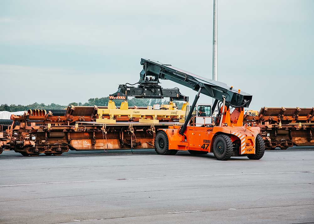 Dein Gerät ist – wie der Name der Tätigkeit schon sagt – ein Reachstacker. Reachstacker sind Flurförderzeuge, die zum Transport innerhalb des Unternehmens sowie zum Stapeln und Bewegen von Containern genutzt werden. Sie sind bis zu 100 Tonnen schwer (Eigengewicht) und können bis zu 50 Tonnen Hublast aufnehmen.